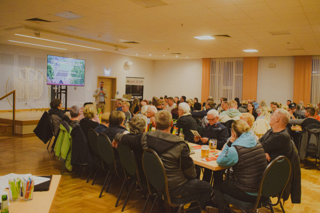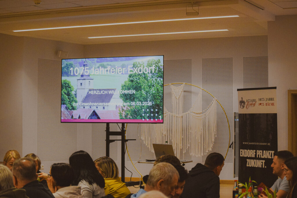 Die 1075-Jahrfeier rückt immer näher. Vom 12.06.26-28.06.2026 werden wir das 1075-jährige Bestehen unseres kleinen Dorfes feiern. Die Vorfreude ist riesig und nur mit genügend Helferinnen und Helfern können wir ein großartiges Fest daraus machen. Aus diesem Grund hat das Festkomitee „1075-Jahre-Exdorf“ am Freitagabend zu einer Einwohnerversammlung in das Kulturhaus eingeladen. Zahlreiche Einwohnerinnen und Einwohner sind diese Einladung gefolgt und fanden sich um 18.30 Uhr im Saal ein. Neben den allgemeinen Informationen des Ortsteilbürgermeisters Florian Büchel stellte Verena Reich das bunte Programm der Jahrfeier vor und warb um die Unterstützung bei den Veranstaltungen. Anschließend konnten sich die Gäste direkt an der Station „Helferkoordination“ für die jeweiligen Posten eintragen, an der Station „Deko“ angeben, ob sie etwas zur Gestaltung des Dorfbildes beitragen können und an der Station „Historie und Traditionelles“ ihre alten Fotos scannen lassen. Nach getaner Arbeit war dann Zeit für das Abendessen und gute Gespräche. Es gab kostenlose Bratwürste und obendrein kostenlose Getränke. Die Stimmung war sehr gut und der Abend fand einen entspannten Ausklang.